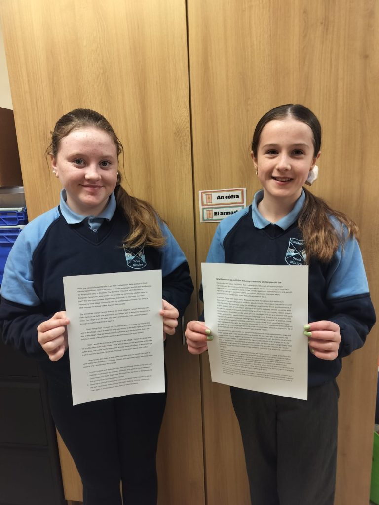 Well done to 6th class pupils Isobel and Kate, who submitted entries to an essay competition, run by MEP Nina Carberry! The essay title was, “If you were an MEP, what would you do to make your community a better place to live?” The girls came up with some wonderful ideas on how they would improve life for Carlanstown residents. There is an amazing prize up for grabs – A trip to Brussels, the home of the European Parliament! Best of luck girls!